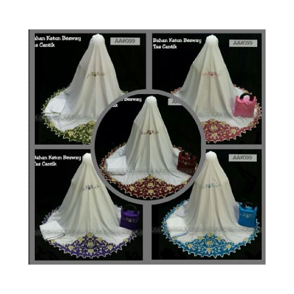 Mukena Katun AA099 @150rb, Bahan Katun Bwsway, Rok Panjang + Mukenah Lebar seperti foto, Bordir Jahit + Tas, XL, 5Warna, biru , hijau, maruun, pink dan purple.